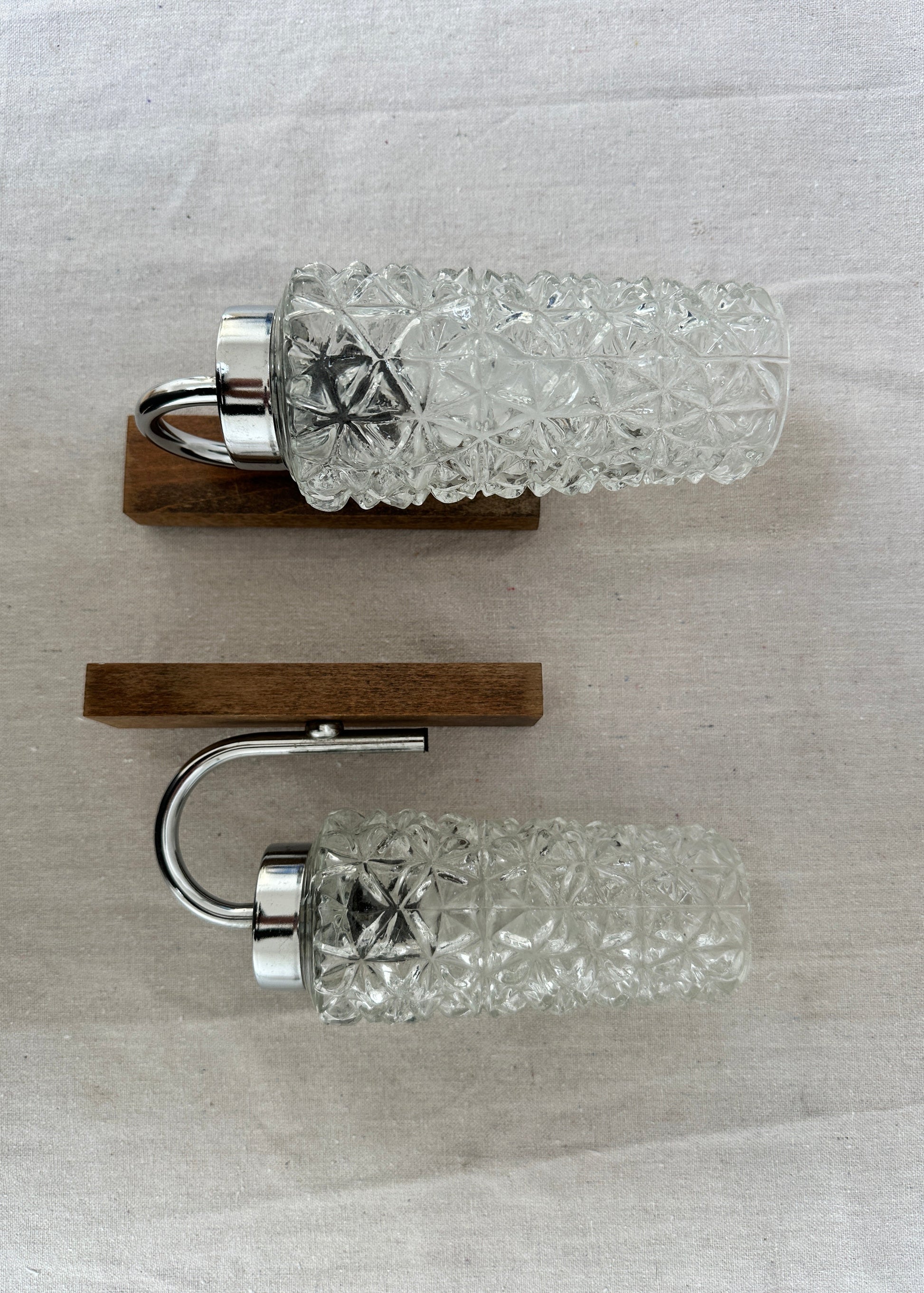 1970s Vintage Glass, Chrome & Wood Wall Sconces