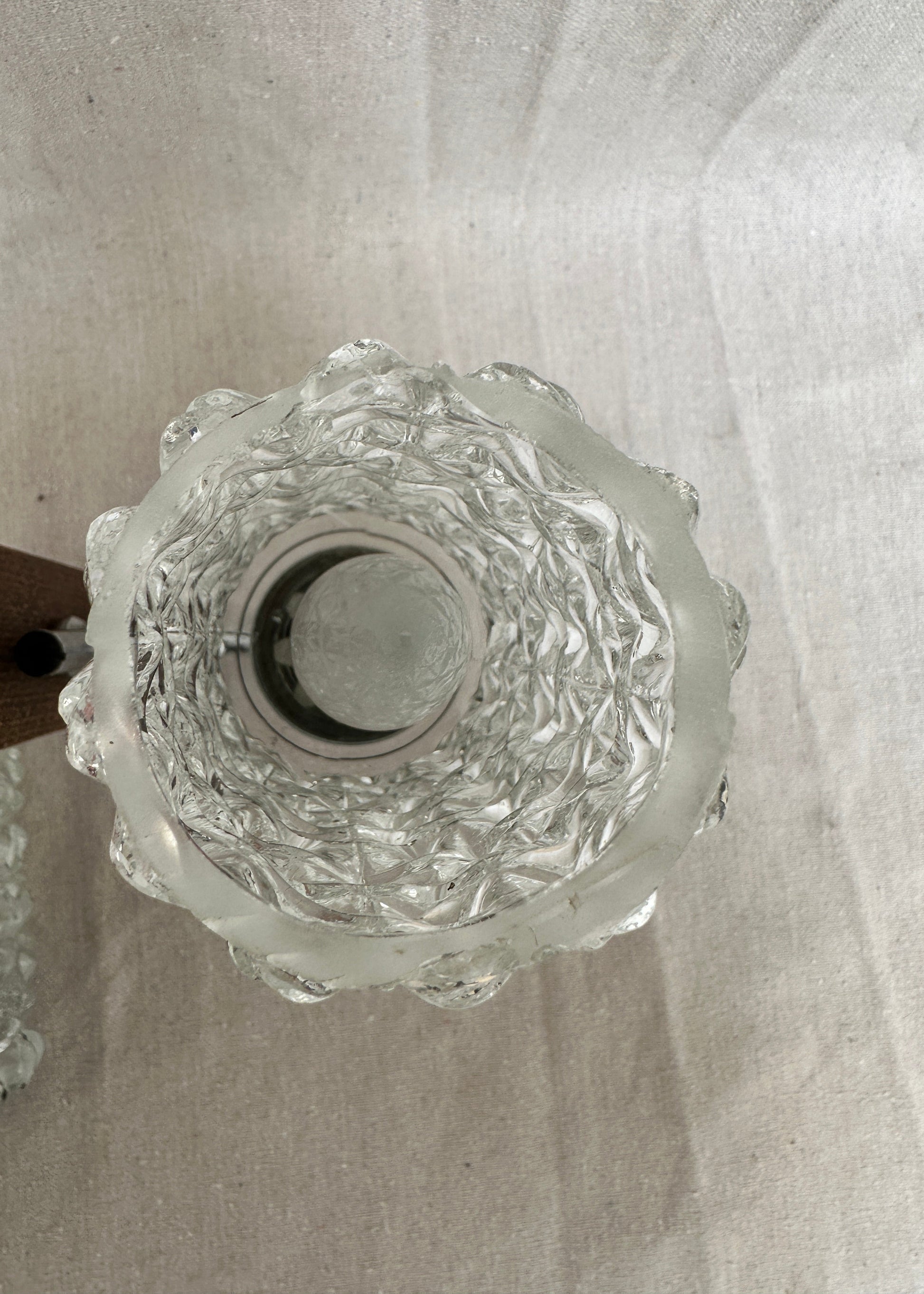 This pair of vintage wall sconces from the 1970s blends natural warmth and modern design. Each light features a beechwood mount paired with a chrome arm and a textured pressed-glass shade, catching and refracting light in a way that feels both sculptural and luminous.