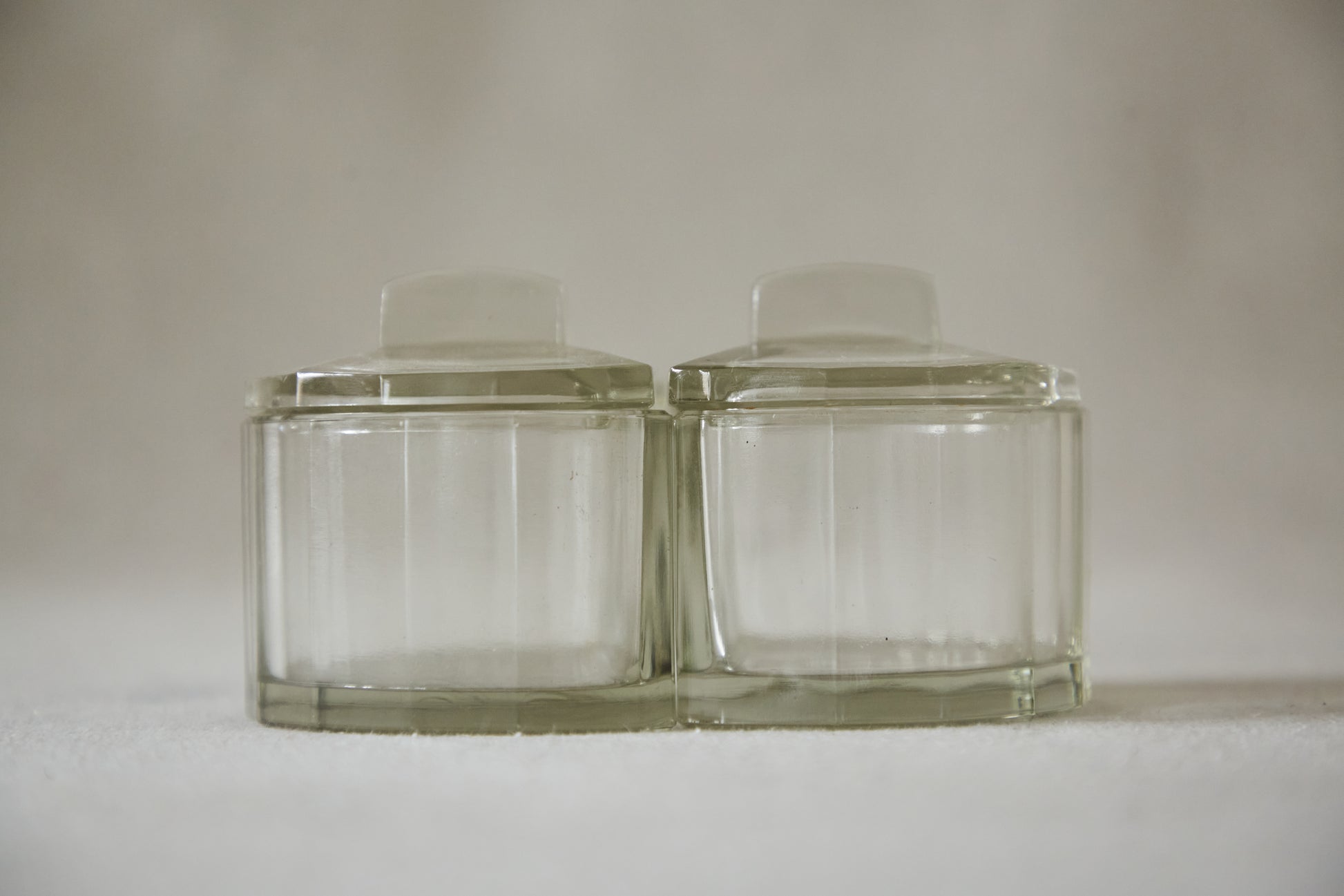 This charming Art Deco glass sugar and condiment jar duo, made in the Czech Republic, captures the elegance and sophistication of the 1930s. Each jar measures 7.5 cm high, 6.5 cm wide, and 8 cm long, and is a perfect pair for adding a touch of vintage style to your kitchen or dining area.