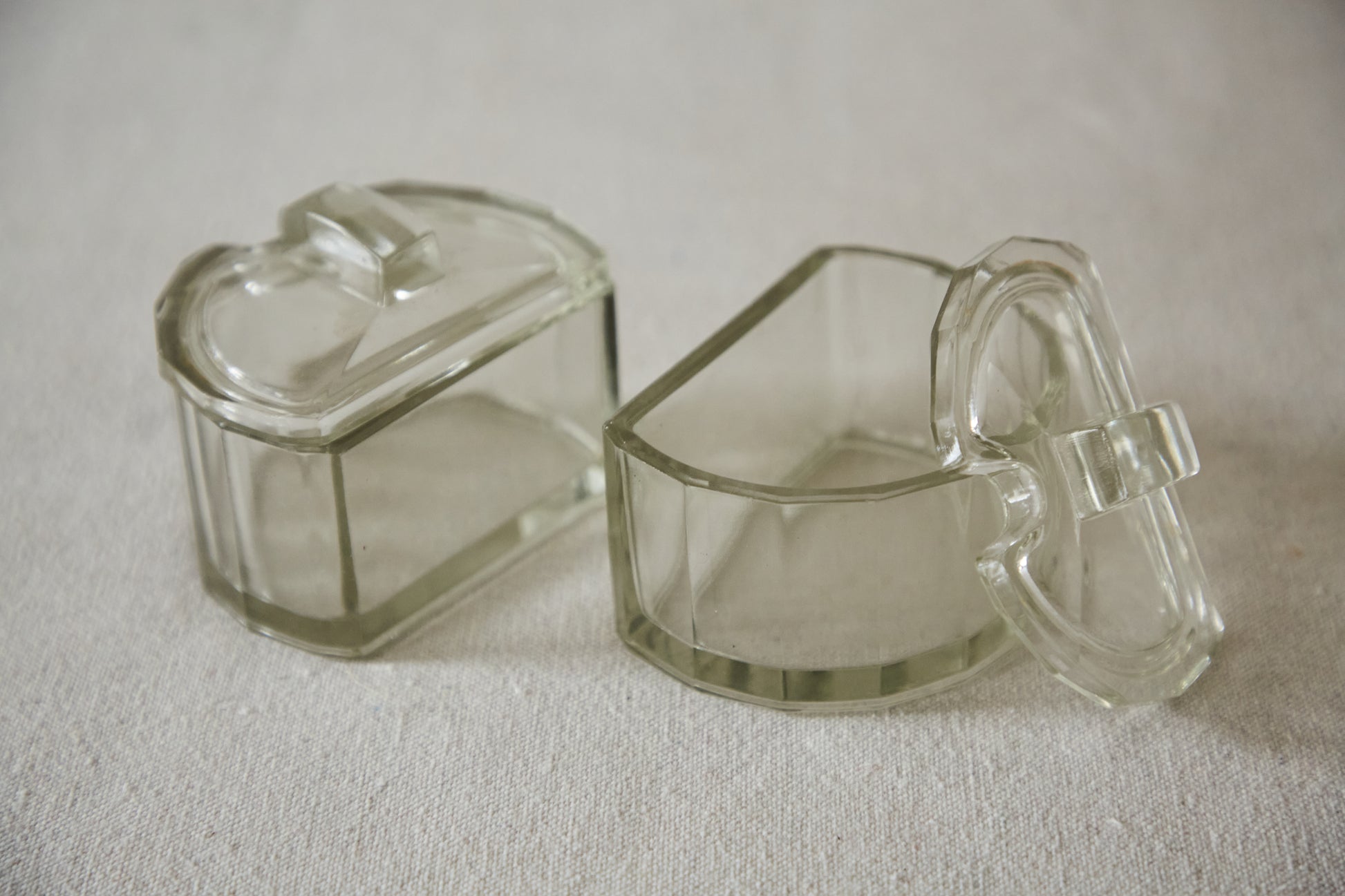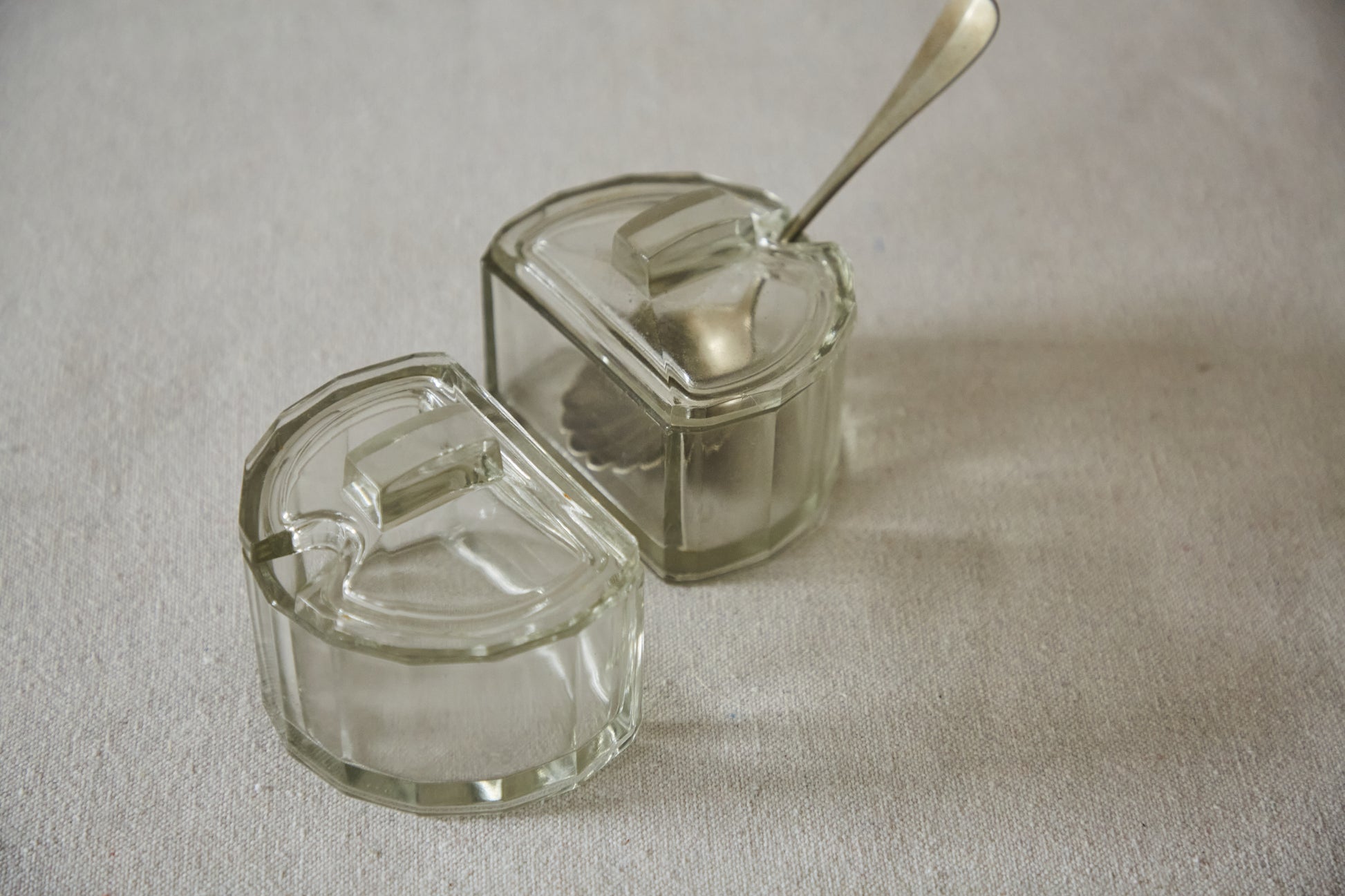 Crafted with clear glass and distinctive Art Deco lines, these jars bring both function and flair to any table setting. Whether used for sugar, spices, or condiments, they make a delightful addition to your home décor or dining collection. Sourced in Antwerp, Belgium, these beautifully designed pieces combine European craftsmanship with timeless vintage charm.