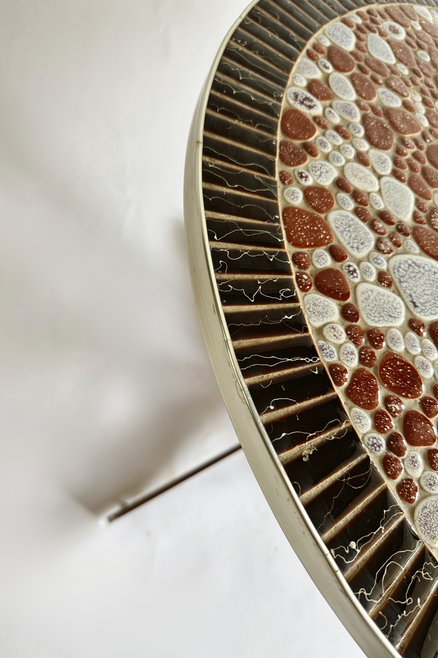 A vibrant expression of mid-century craftsmanship, this round coffee table features a richly textured ceramic mosaic top in a palette of rust, ivory, and charcoal tones. The organically shaped tiles form a pebble-like surface, bordered by radial black segments that add depth and structure. Set on a minimalist three-legged metal base, it bridges decorative artistry with functional form — ideal as a statement piece in a collected, design-led interior.