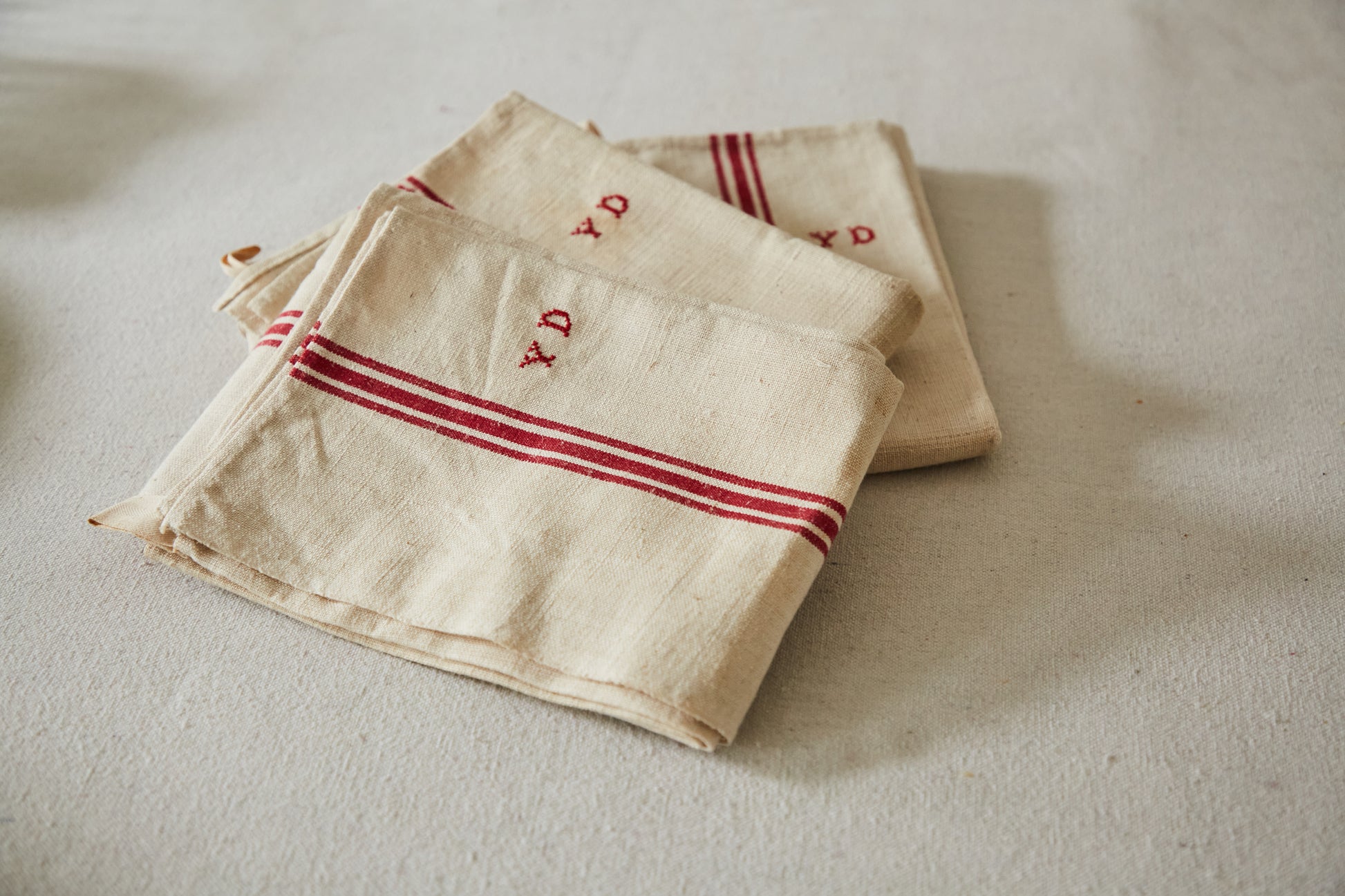 Three tea towels Y D embroidery