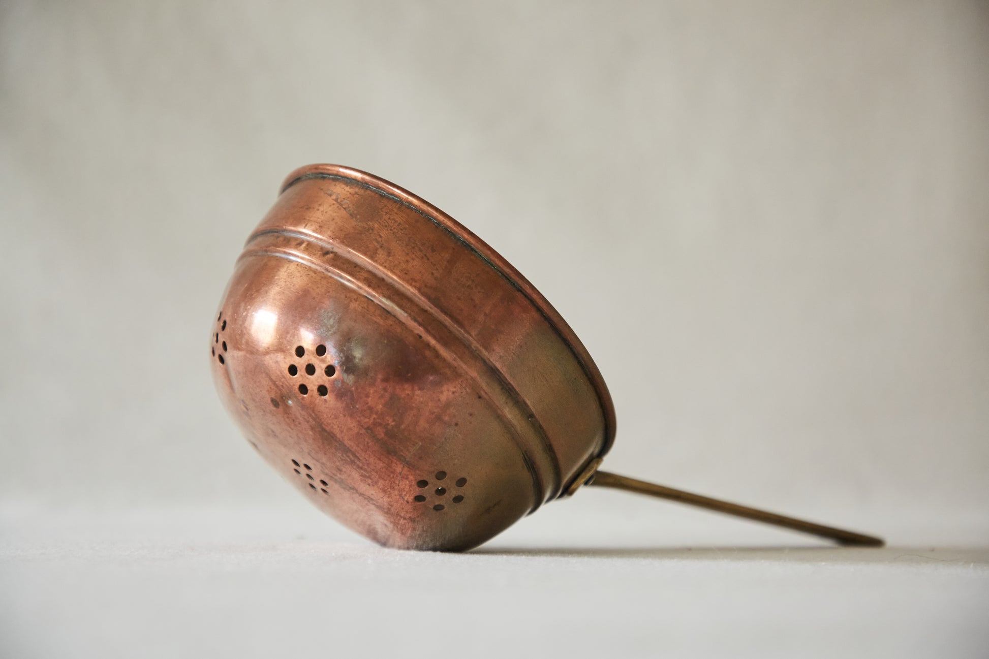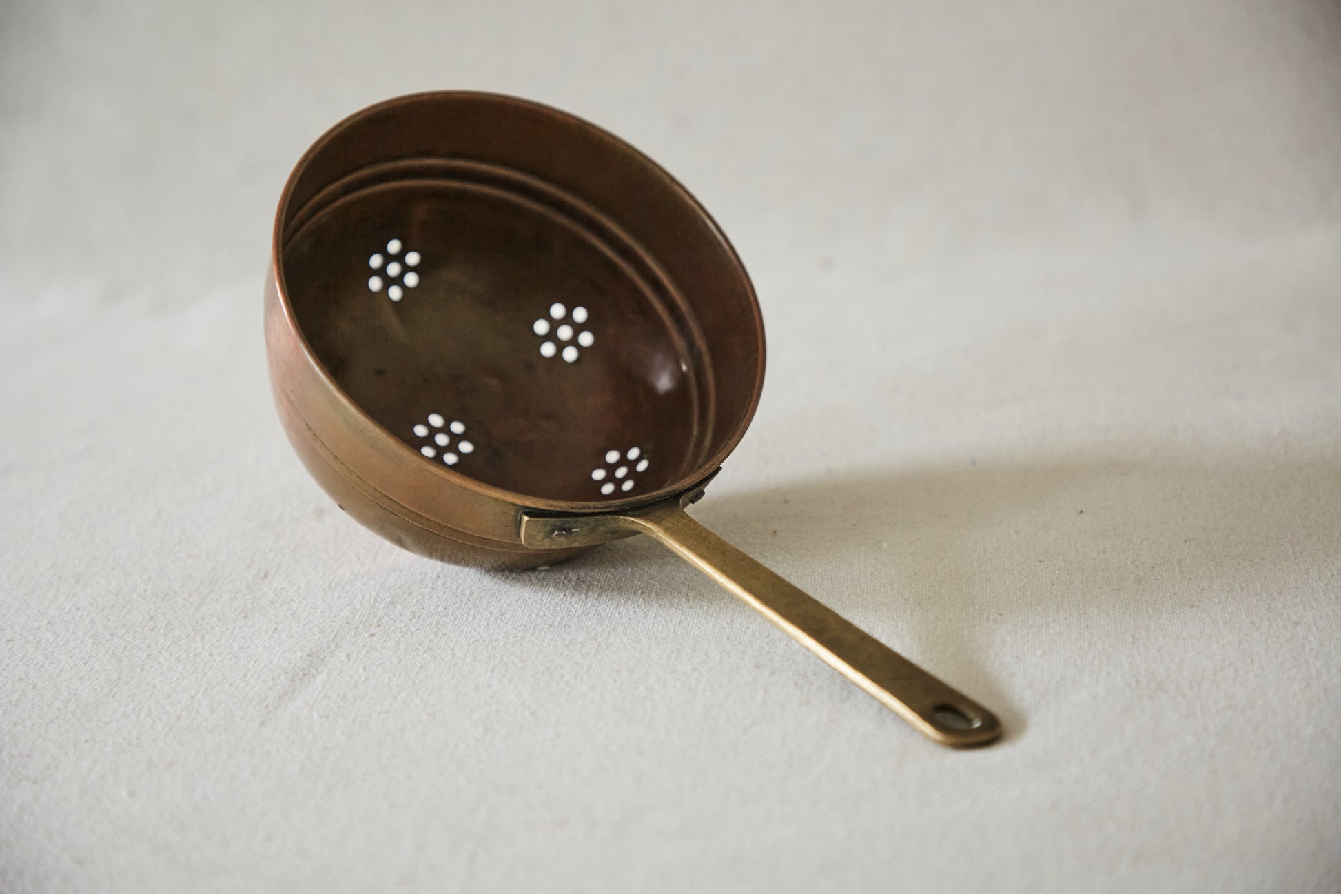 This French copper colander features a brass handle, offering both functionality and vintage appeal. Remains in good used condition, with some age-related wear—common for items of this age.