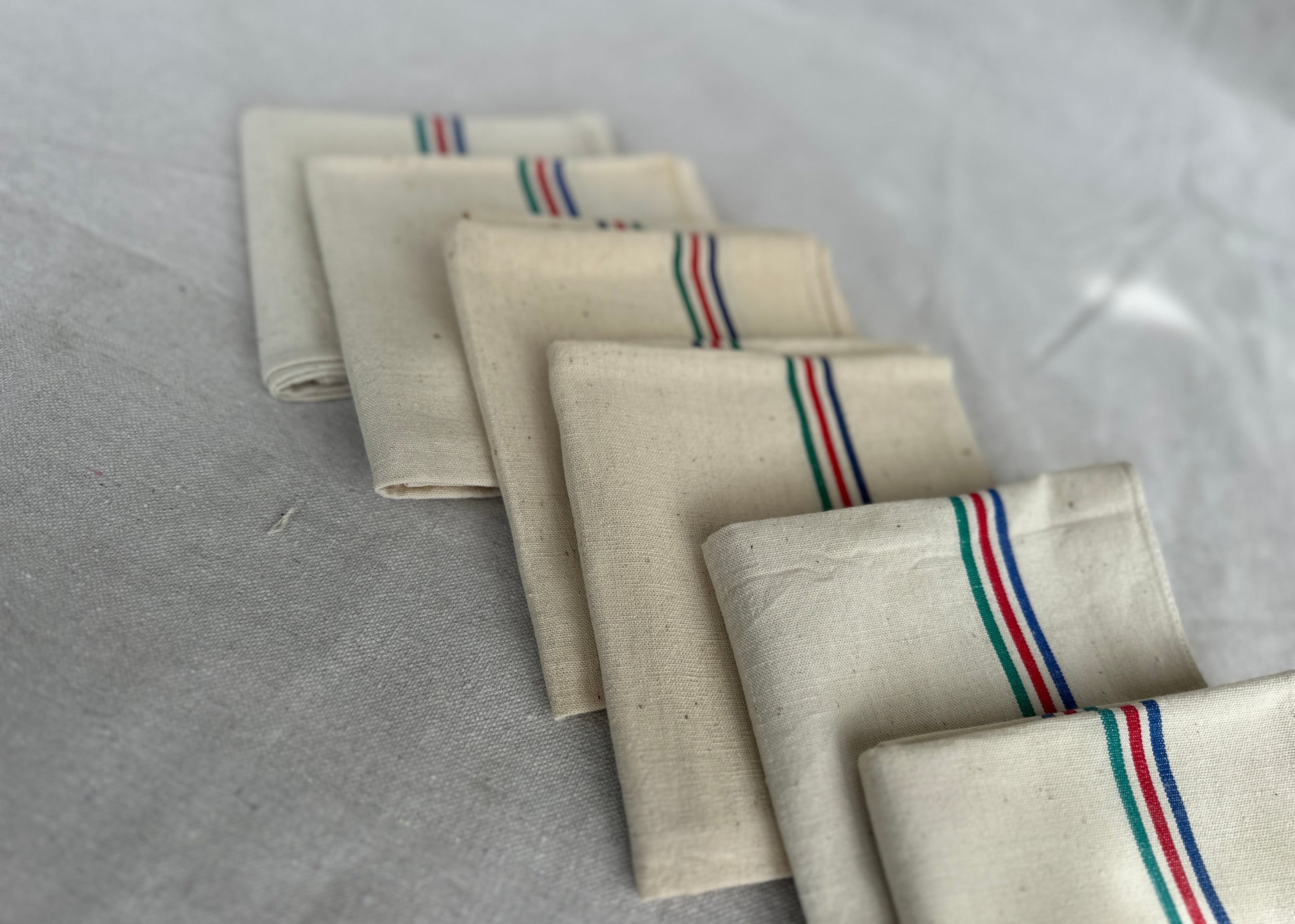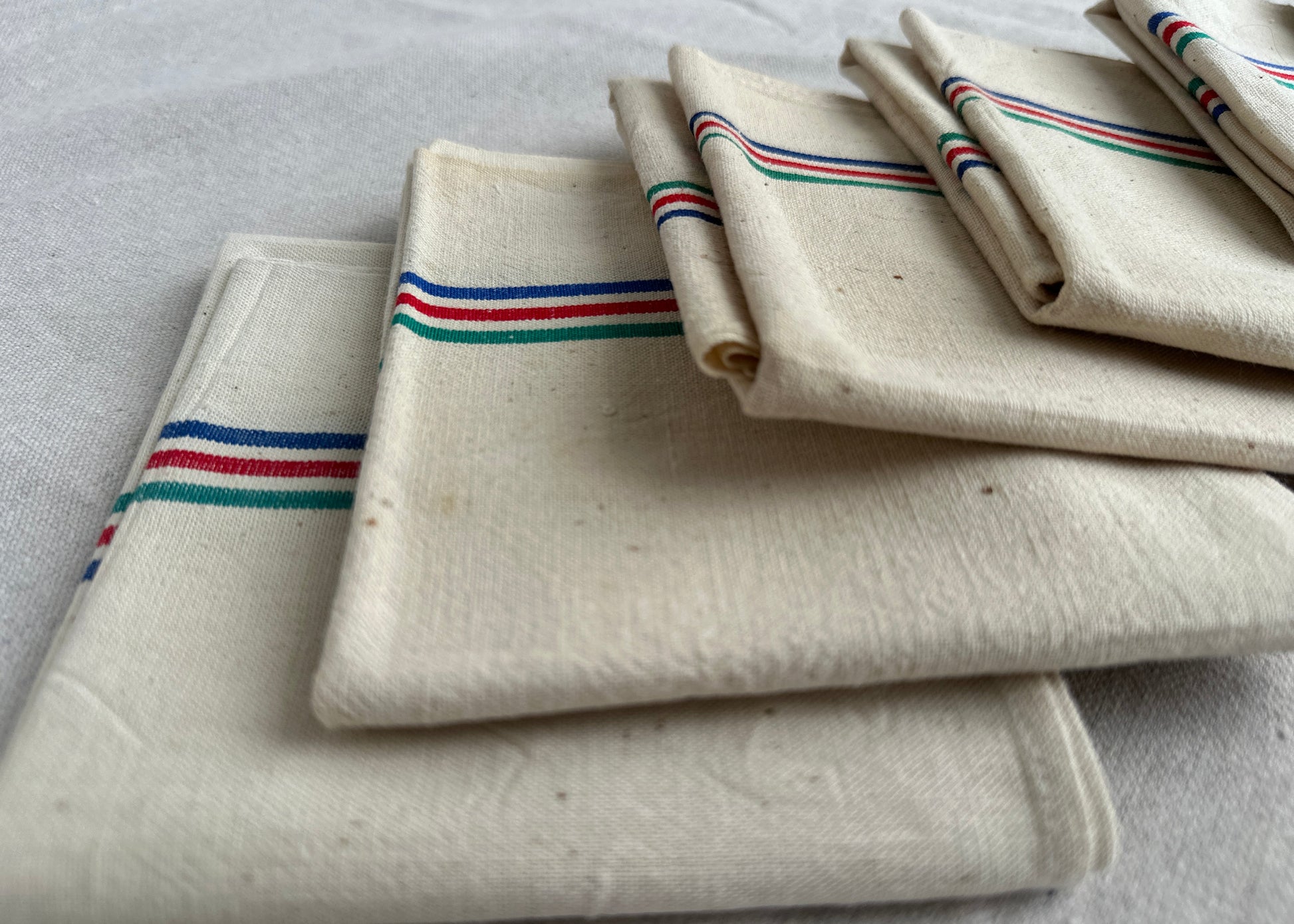 Set of 6 Vintage French striped striped tea towel, pale cream in color with green, red and blue stripes. These have never been used, they come from being stored away for many years. They are a beautiful addition to any kitchen, can also be repurposed for cushions or tote bags.