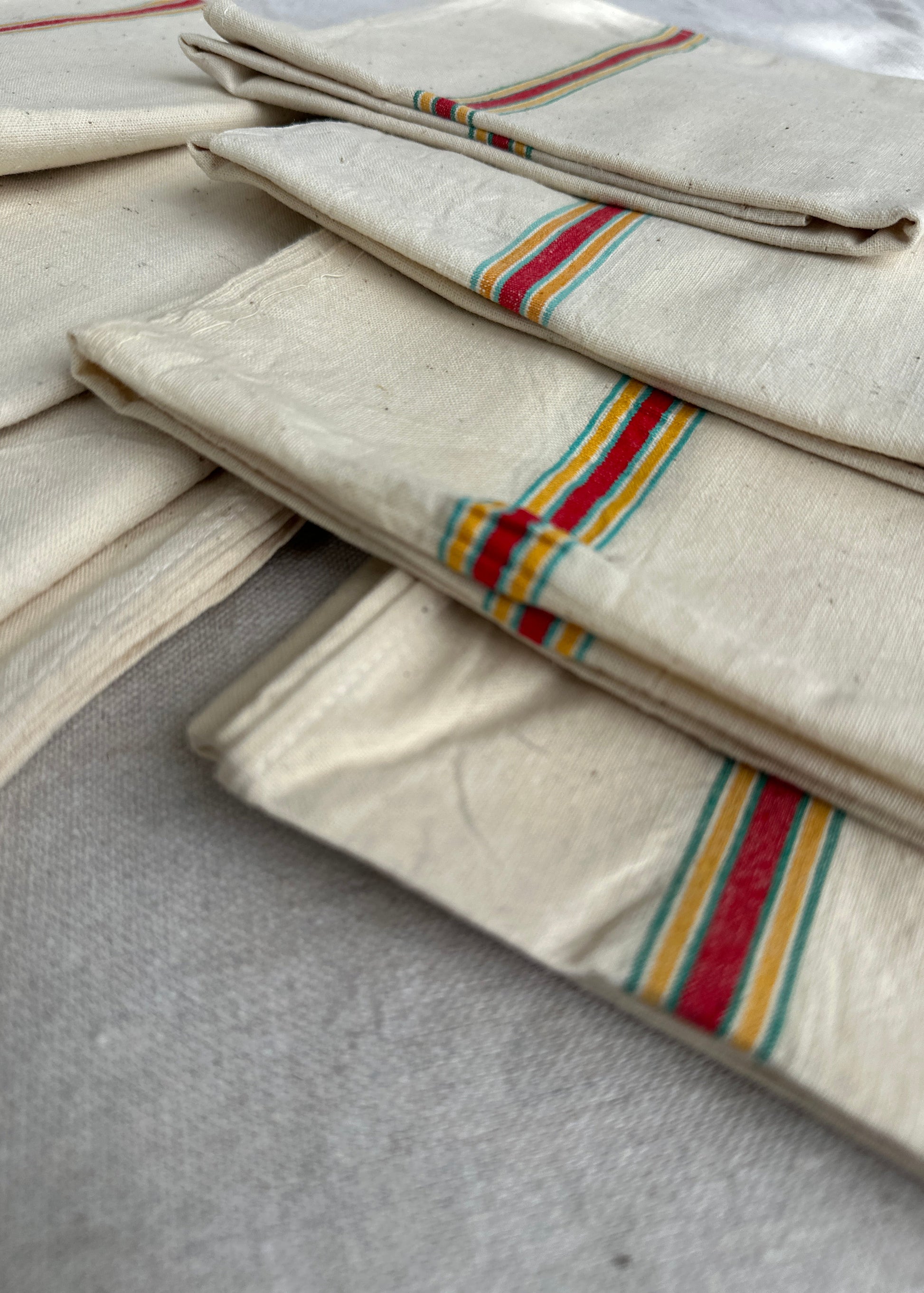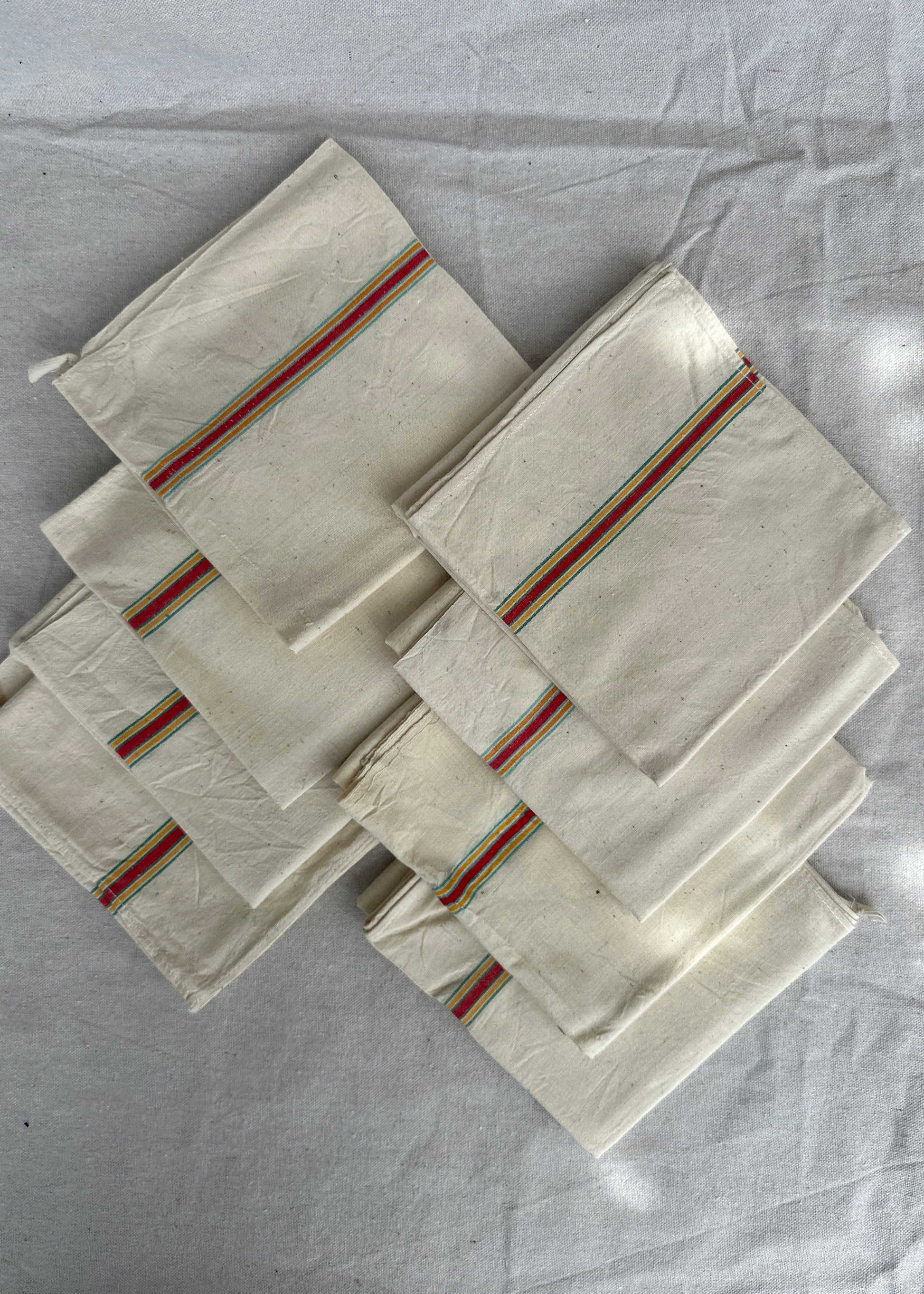 Set of 8 French Vintage striped tea towels , pale cream in color with red, yellow and green stripes. These have never been used, they were stored away for many years.