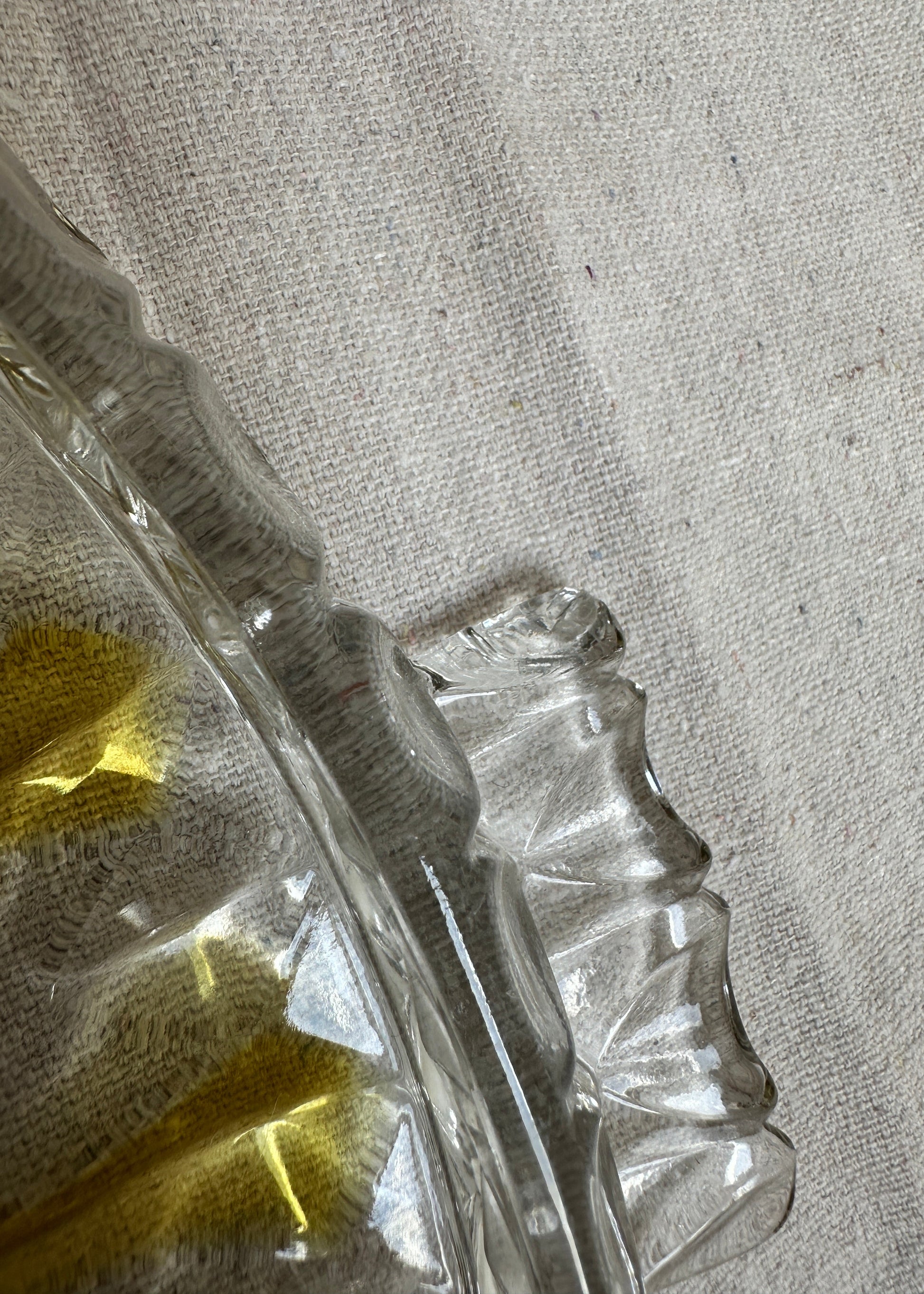A striking example of mid-century German glassmaking, this platter by Walther Glass balances form and function with sculptural ease. Crafted from pressed crystal glass in clear and golden tones, its underside reveals polished geometric reliefs, while the surface remains smooth and luminous.